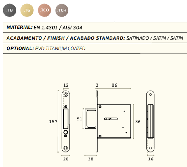 Zirkelriegelschloßset mit quadratischen Griffmuscheln und Stirngriff mit 30 mm ø Durchmesser sowie abgerundetem Stulp in verschiedenen Finishes