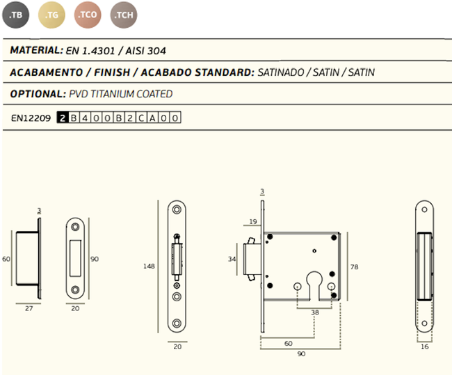 Schiebetürschloß mit Riegel und "ausfahrenden" Haken mit abgerundetem Stulp in Edelstahl matt gebürstet.